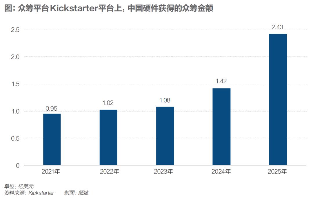 众筹平台(Kickstarter/Indiegogo)成为不少产品初期的引爆点。深圳的inno100门店是Kickstarter在中国的合作伙伴,门店负责人告诉《财经》:“以前全球一年也就二三十个百万美元级众筹项目,2025年已经有四五十个,千万美元级项目从2024年的一个涨到了六个。”