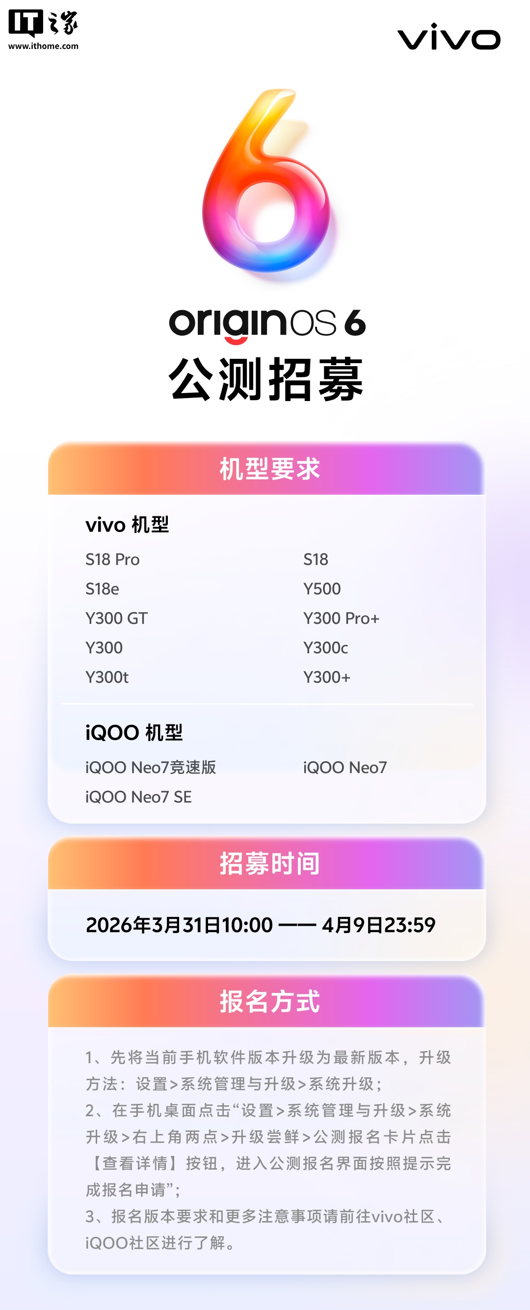 IT之家 3 月 31 日消息,vivo 今日官宣,OriginOS 6 新一轮公测开启招募。IT之家附具体招募机型如下: