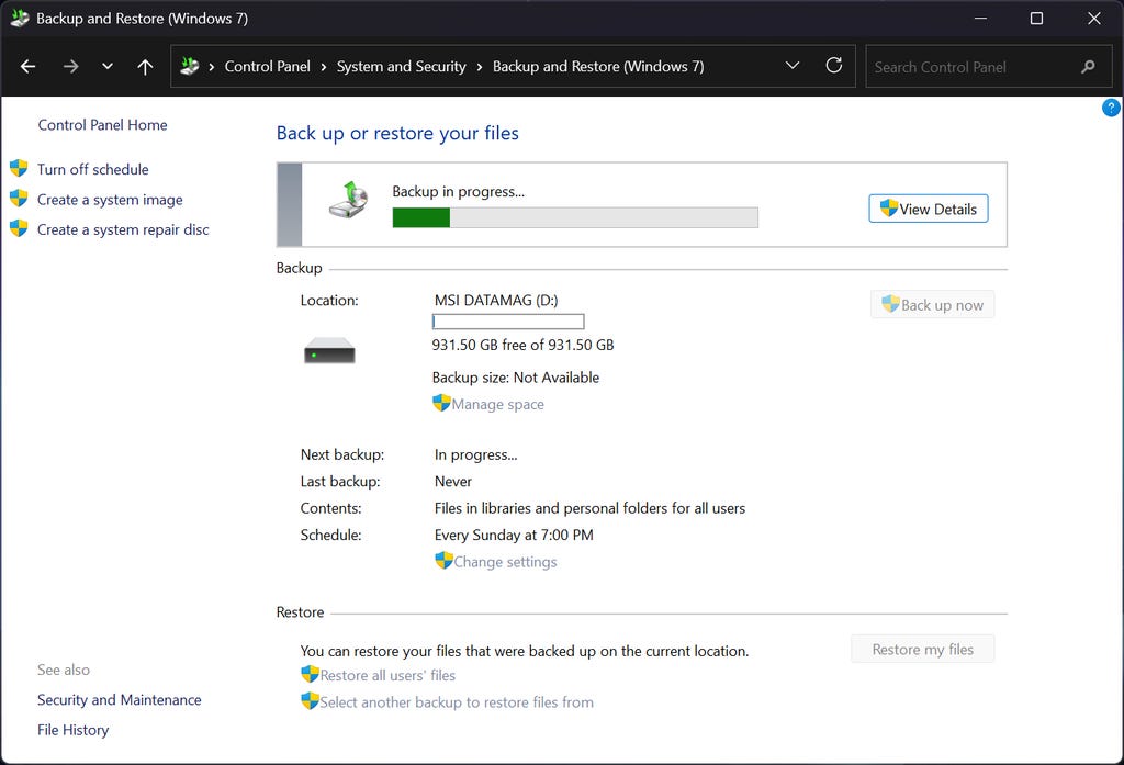 在控制面板的这个位置,你可以通过简单点击立即备份按钮,手动启动备份。默认情况下,Windows系统会每周自动进行一次备份,不过你也可以在设置里更改备份计划。同样在这个位置,你还能从之前的备份中恢复文件。