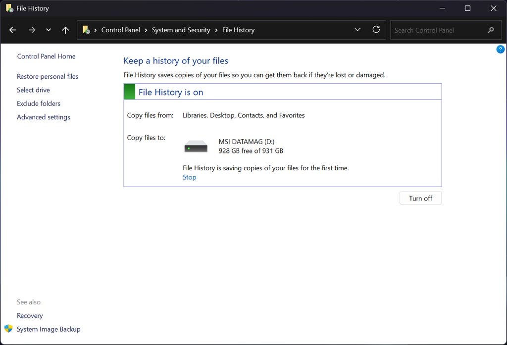 “文件历史”是另一个可以从Windows控制面板访问的备份工具。转到系统和安全 > 文件历史,就能启用它了。它会复制Windows库里本地文件夹的文件,还有桌面上的所有内容,以及你的联系人和收藏夹。在左侧,你可以点击排除文件夹,告诉“文件历史”跳过某些不想备份的内容。