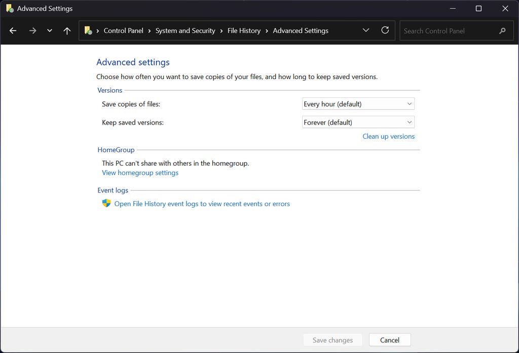 要是你点击左侧的高级设置,就可以选择“文件历史”多久保存一次你的文件,以及保存多长时间。默认情况下,“文件历史”会每小时备份一次你的数据,不过你也可以设置为每10分钟或者一天备份一次。“文件历史”会一直保留备份,但你可以根据实际需求,把它更改为保留文件一个月到两年之间,或者保留足够的空间。