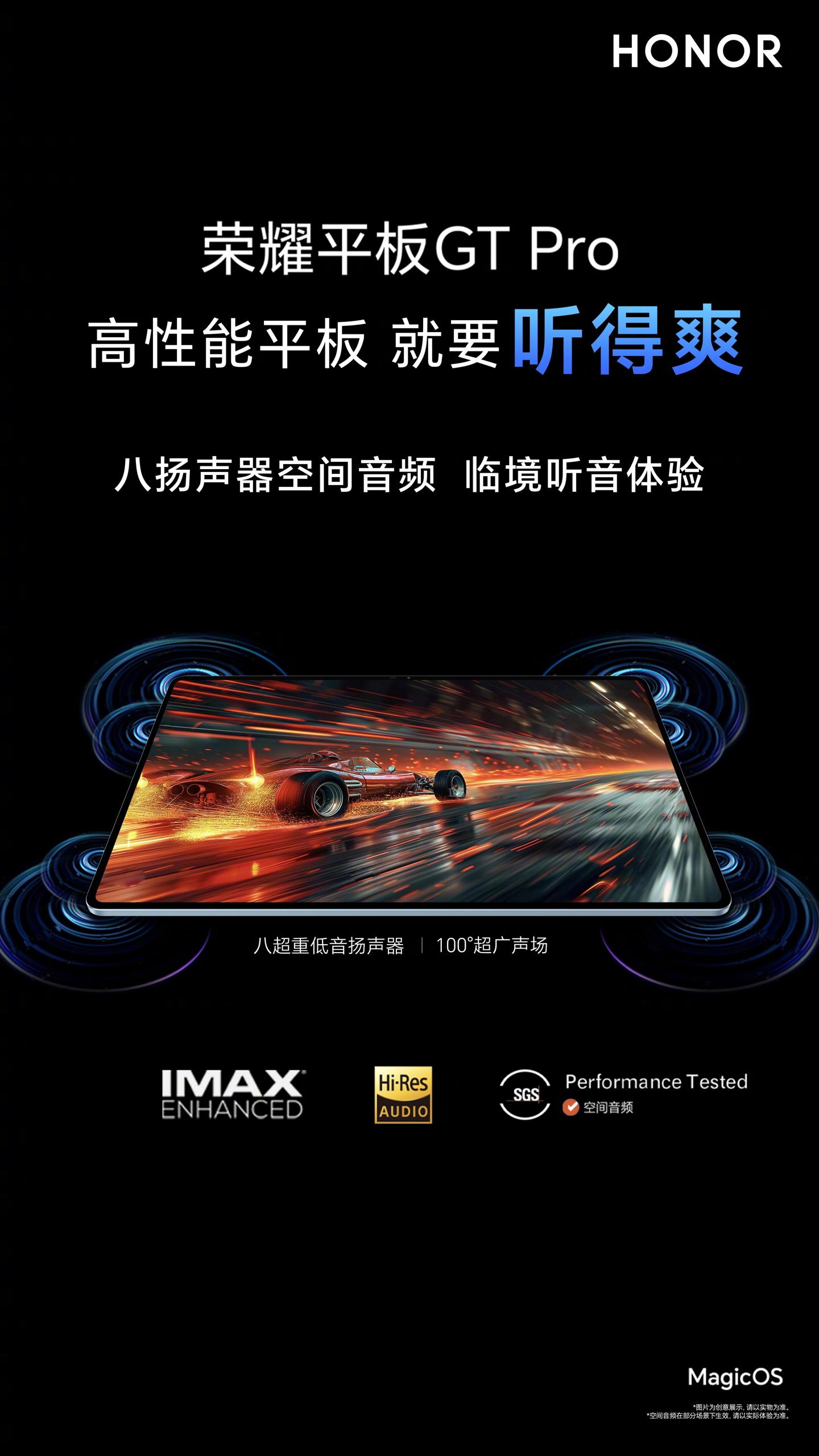 荣耀平板 GT Pro 采用八超重低音扬声器,通过了 IMAX ENHANCED、Hi-Res Audio 认证,支持空间音频。
