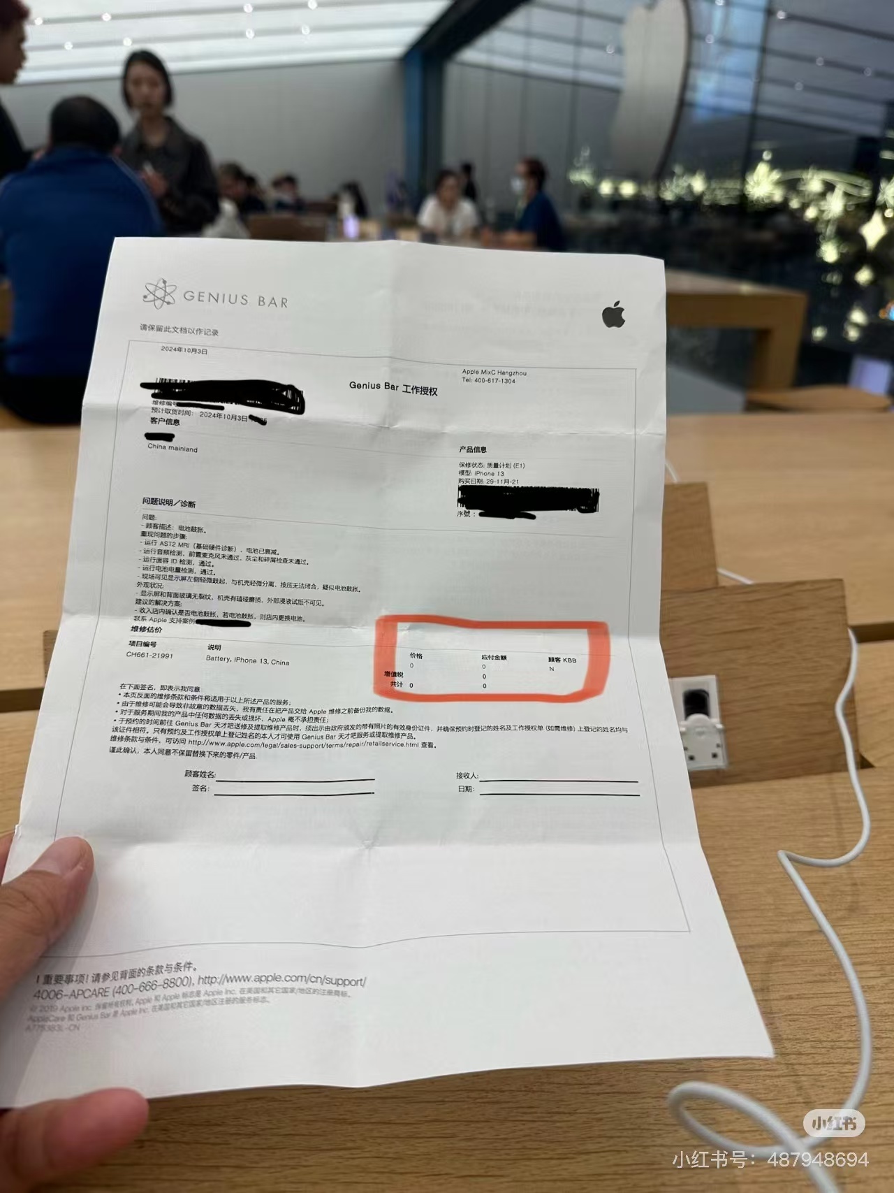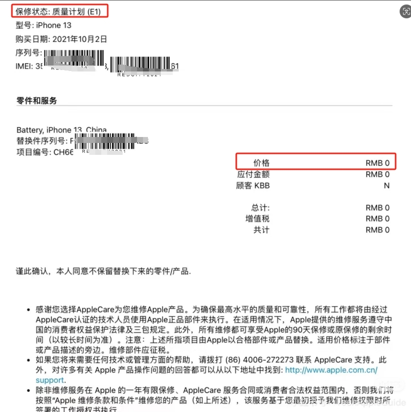 成都的张先生是一名成功免费给iPhone 13更换电池的博主。他介绍,自己的手机是2021年10月份买的,最近电池容量下滑严重,只有62%,而且也有一点点的鼓包现象。看到苹果可以免费换电池的帖子后,就去了线下直营店咨询。苹果直营店工作人员在他的手机上经过了一番操作,最后显示维修费用就是0元,虽然成功了,但张先生也不清楚具体需要符合什么样的条件才能免费维修。