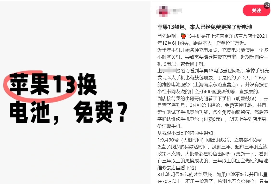 凤凰网科技讯 (作者/李信臻)10月12日,今年6月,苹果iPhone13被曝出现“扎堆”鼓包问题。近日,社交平台上出现大量分享苹果iPhone 13 电池鼓包免费换新的帖子。一些帖子称,iPhone 13遇到了电池鼓包或者电池容量衰减的问题,拿去苹果直营店维修,最后免费更换了新的。但也有帖子称,只有电池出现明显的鼓包才给免费换,而且直接询问电池鼓包是否可以免费维修,则被告知需要经过检测。