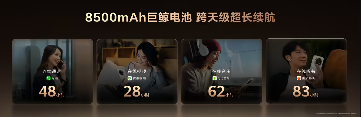 华为畅享 90 Pro Max 搭载的 8500mAh 华为巨鲸大容量电池,直接刷新了同档位的续航上限。配合 AI-BMS 算法、聚能泵等多项电池优化技术,它实现了电量的高效稳定释放,也是同档位唯一通过电池容量释放率 SGS 五星认证的产品。此前在 AWE 博览会的直播中,余承东就曾直言,这款机型的续航能力“超级强,强到出门可以不用带充电宝”。对普通用户而言,日常轻度使用可实现两天一充,哪怕是全天高频重度使用,也能稳稳支撑到回家充电,彻底告别了电量焦虑。