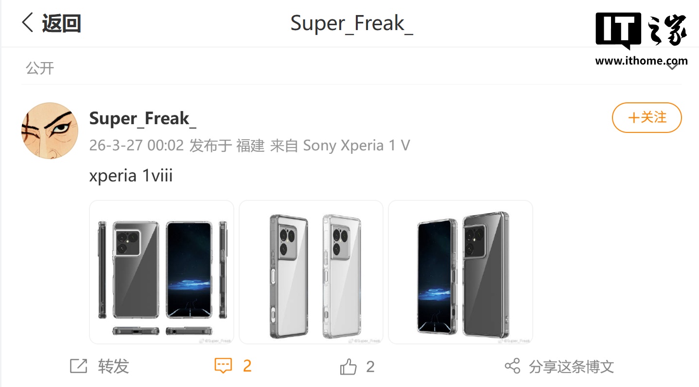 IT之家 4 月 2 日消息,消息源 @Super_Freak_ 于 3 月 27 日发布微博,分享了一组手机壳渲染图,展示了索尼旗舰手机 Xperia 1 VIII,可能彻底改变索尼手机多年来坚持的家族式设计语言。