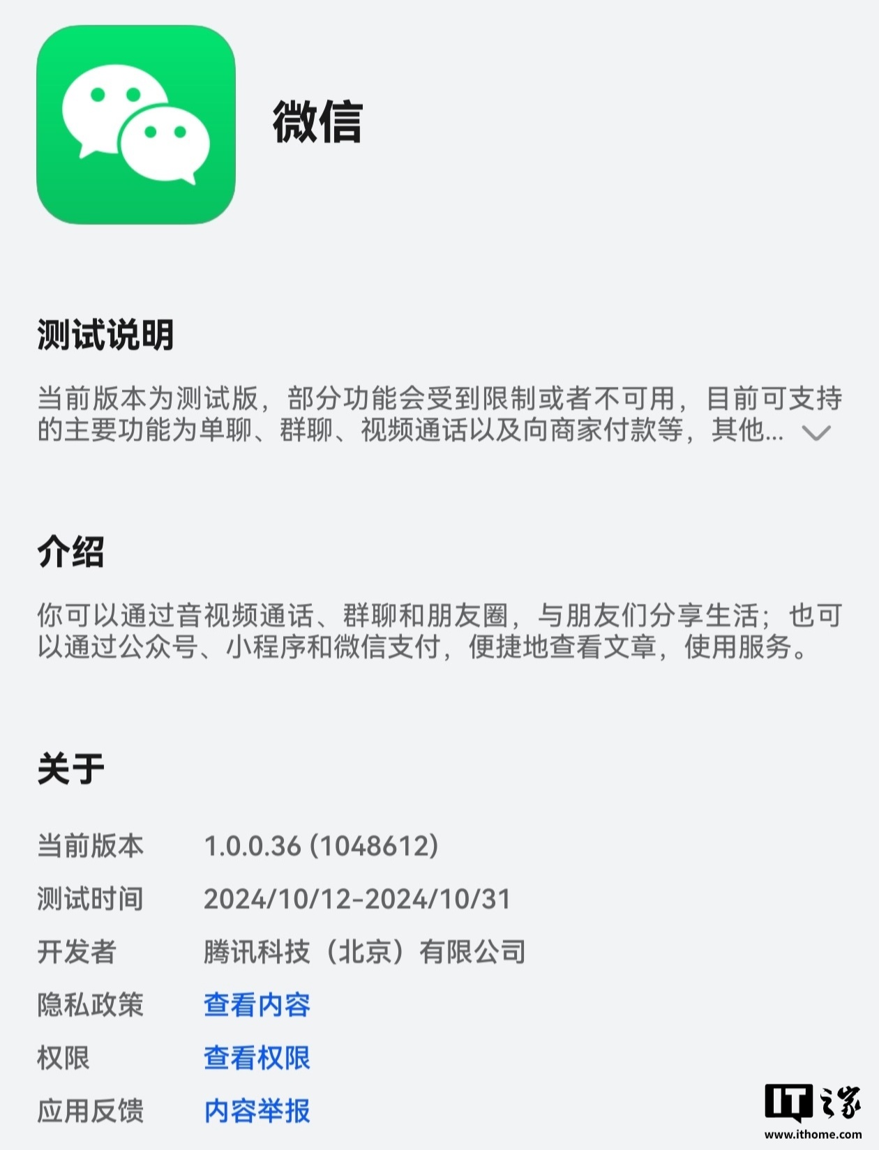 IT之家 10 月 12 日消息,微信鸿蒙原生版今日下午正式上架鸿蒙原生应用市场,版本号 1.0.0.36,目前正在分批放量中,大家可以从华为应用市场(AppGallery)->【我的】-> 【应用尝鲜】中下载,测试资格有限,先到先得。