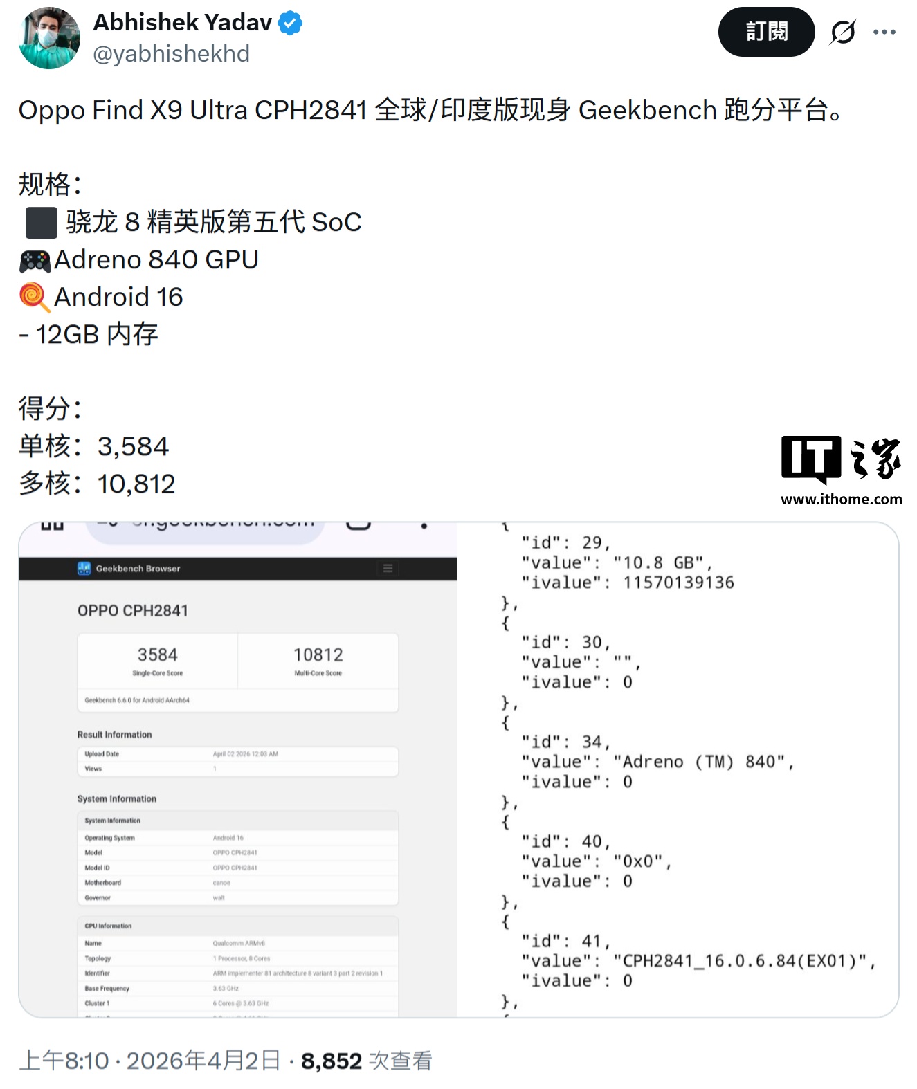IT之家 4 月 3 日消息,消息人士 Abhishek Yadav 昨天在 X 平台发文称,OPPO Find X9 Ultra 手机全球版最近出现在 Geekbench 跑分数据库。