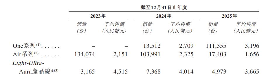 2025年,XREAL的5.16亿元收入中,AR眼镜销售占4.03亿元(78.1%),配件占0.73亿元(14.1%),服务及其他占0.40亿元(7.8%)。这意味着公司几乎完全依赖硬件销售,且高度集中于三大产品线:Air系列(入门级,均价约1656元)、One系列(中高端,均价约3196元)、以及Light-Ultra-Aura系列(旗舰/开发者版,均价约3665元)。2025年One系列销量达11.1万台,贡献绝大部分增量;Air系列销量仅1.7万台,较2024年的10.4万台大幅下滑;Light-Ultra-Aura产品线全年销量4973台。