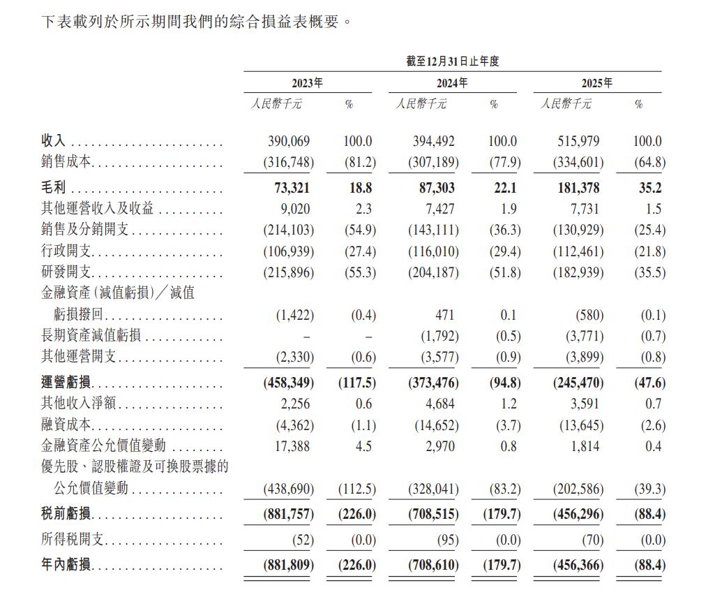从营收质量层面看到,公司毛利率从2023年的18.8%一路攀升至2025年的35.2%,经调整净亏损也从4.37亿元收窄至2.50亿元,已经显示出XREAL正处于“大踏步前进”的状态。