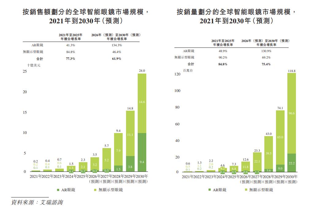 根据艾瑞咨询(iResearch)数据,按销售收入计,XREAL在2022年至2025年间连续四年在全球AR眼镜市场中位居第一。在包含无显示智能眼镜在内的整体智能眼镜市场中,2025年XREAL按销售收入计排名全球第二、中国第一。2025年,XREAL的全球AR眼镜营收市占率27.0%、销量市占率24.8%,均位列第一。