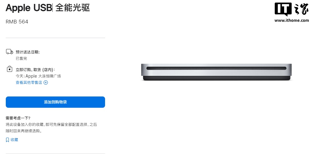 MacRumors 发现,苹果这款外置光驱已经在美国售罄“数月”,而且目前在所有国家及地区都也已经售罄或下架(国内似乎仅大连一家门店可以取货,但官网显示已售完)。鉴于它至今仍未恢复销售,这款已有 16 年历史的配件预计已经不再生产,等待库存逐步清空。