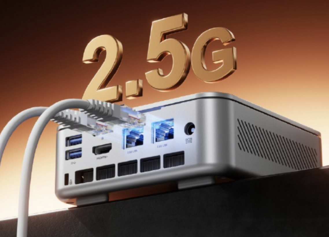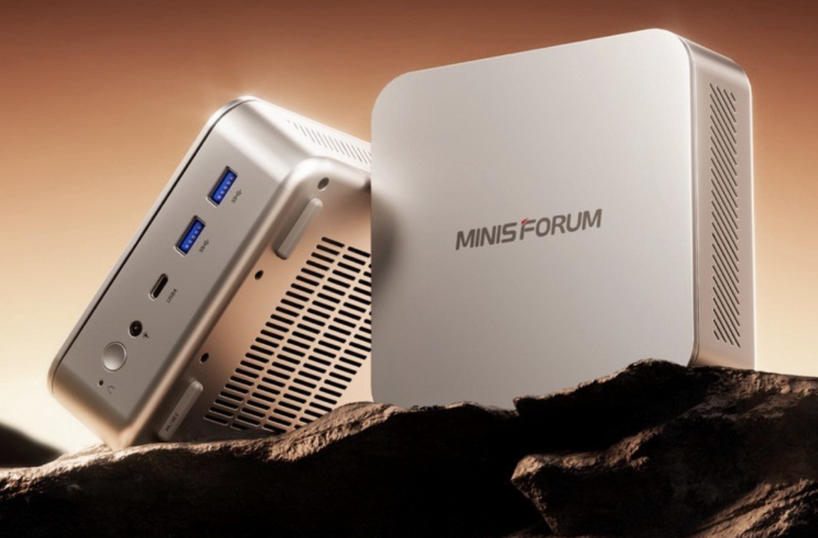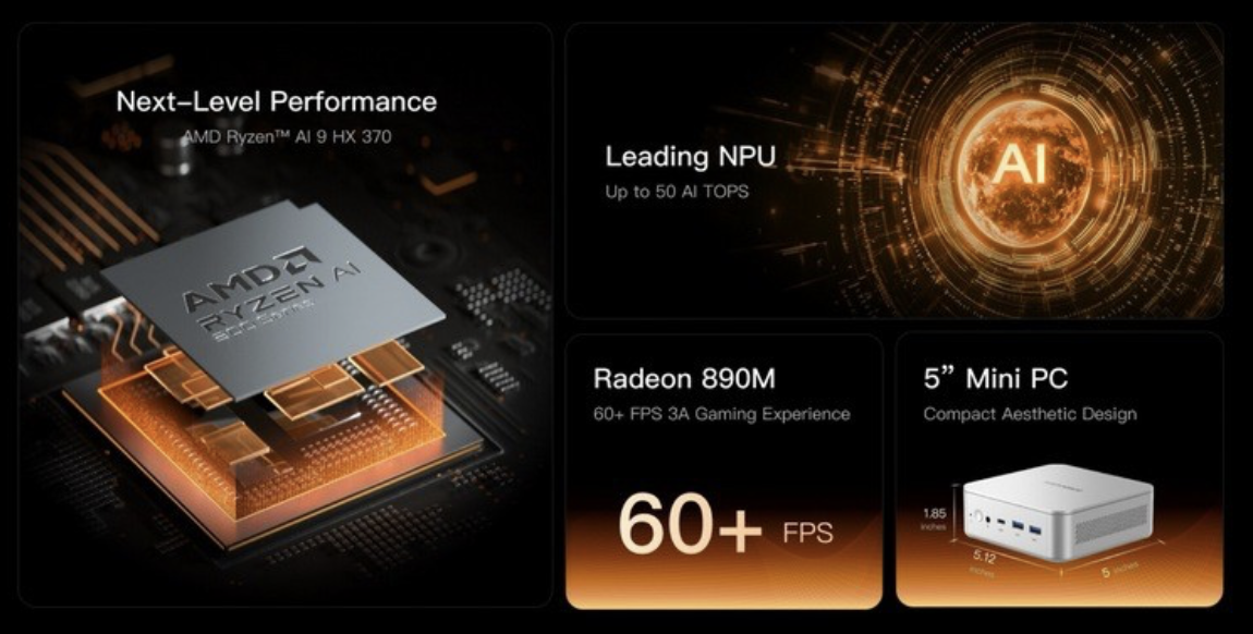 该机采用常规方形造型,一体金属机身,机身尺寸为 13 x 12.7 x 117.5 cm,整体体积 0.78L,搭载 12 核心 24 线程 AMD 锐龙 AI 9 HX 370 处理器,集成 AMD Radeon 890M 核显,配备双通道 LPDDR5X RAM 和双 PCIe 4.0 SSD 固态硬盘。