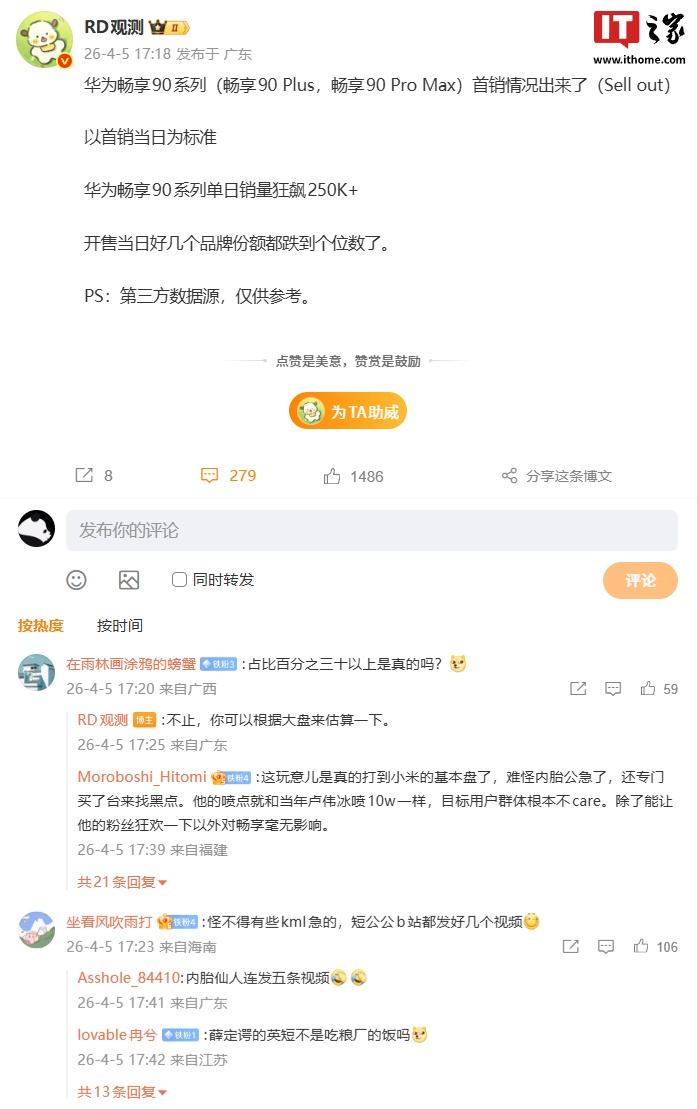 IT之家 4 月 5 日消息,长期关注国内手机市场份额的博主 @RD观测 今日分享了华为畅享 90 系列(含畅享 90 Plus 和畅享 90 Pro Max)首销情况(第三方数据源,仅供参考)。