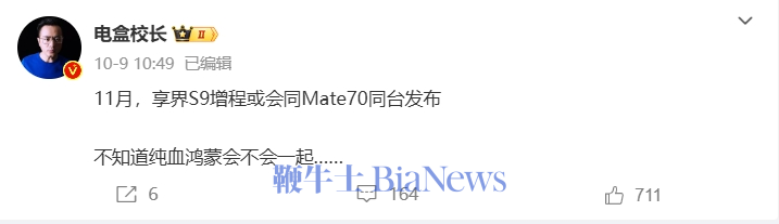 鞭牛士 10月12日消息,据微博大v电盒校长爆料,华为或将于11月同台发布Mate 70系列手机及享界S9增程。