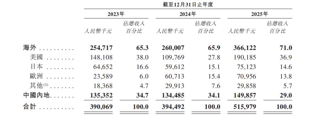 XREAL已稳居赛道龙头,2022年至2025年连续4年稳居全球AR眼镜市场之首,2025年市场份额27%。公司重点布局海外市场,2023年至2025年,海外收入分别约2.55亿元、2.60亿元和3.66亿元,分别占总收入65.3%、65.9%和71.0%。其中,美国市场收入占比过半。
