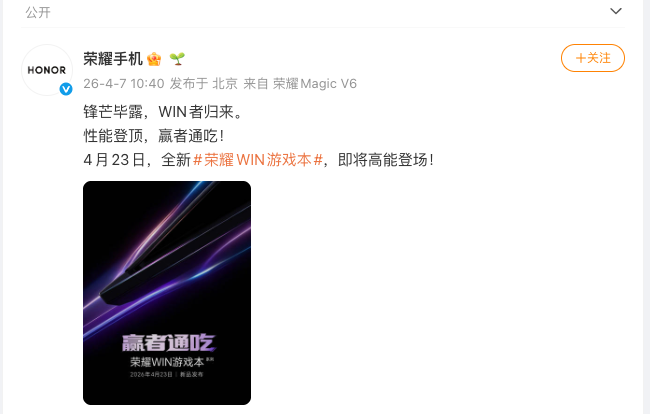 IT之家 4 月 7 日消息,荣耀官方正式发布全新荣耀 WIN 游戏本定档海报,明确官宣新品发布会将于 4 月 23 日正式发布。