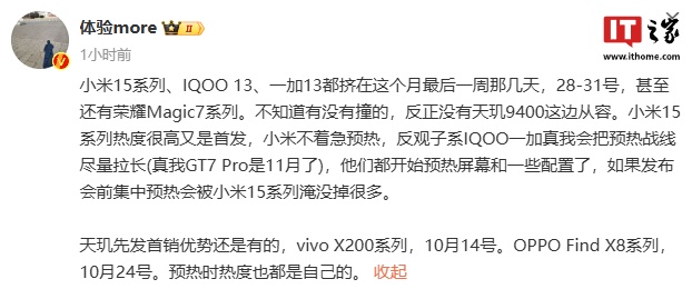 IT之家注意到,博主 @体验more 昨日(10 月 11 日)爆料称,小米 15 系列、iQOO 13、一加 13 都挤在这个月最后一周那几天,28-31 号,甚至还有荣耀 Magic7 系列,真我 GT7 Pro 是 11 月了。