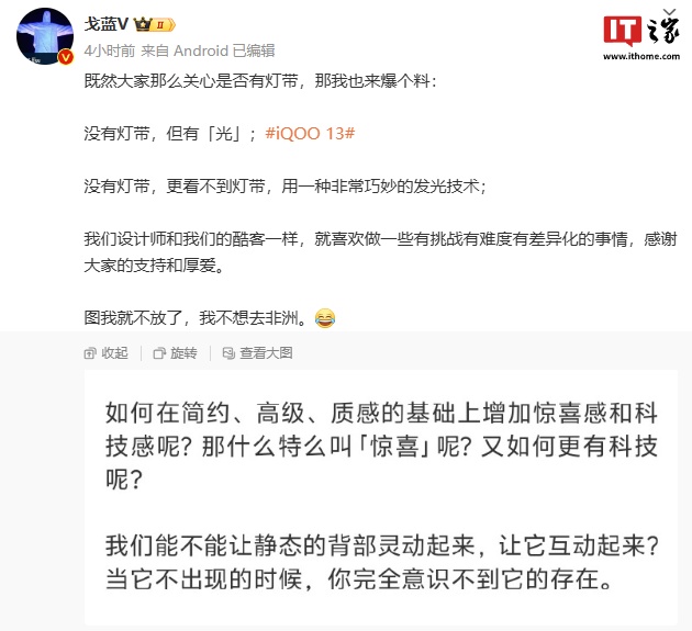 对此,iQOO 产品经理 @戈蓝V 则回应称:“没有灯带,但有「光」;没有灯带,更看不到灯带,用一种非常巧妙的发光技术。”