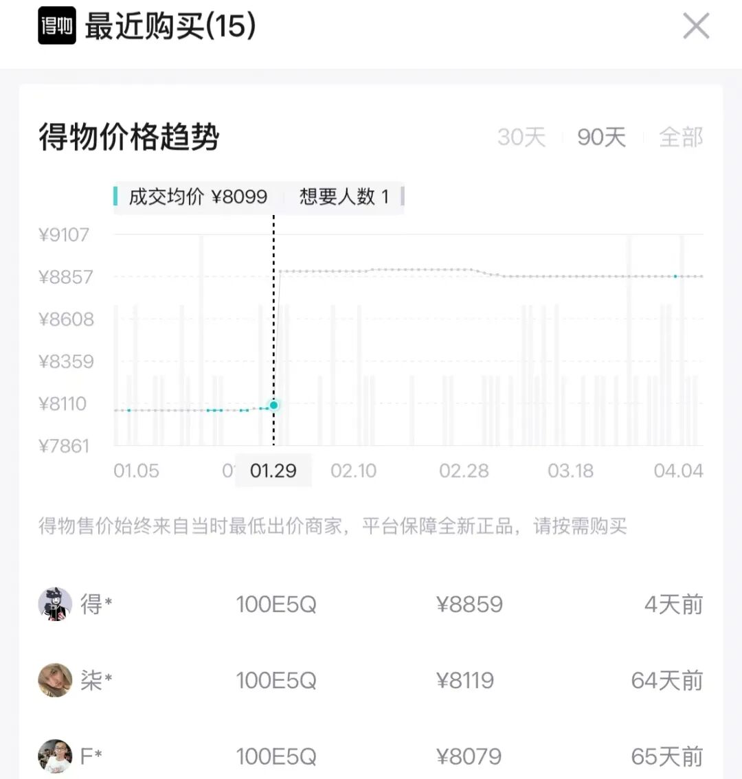比如海信小墨E5Q100英寸电视,亿欧在得物APP查询发现,其市场成交价已由1月底的8099元,上涨至8859元,涨幅约9.4%。