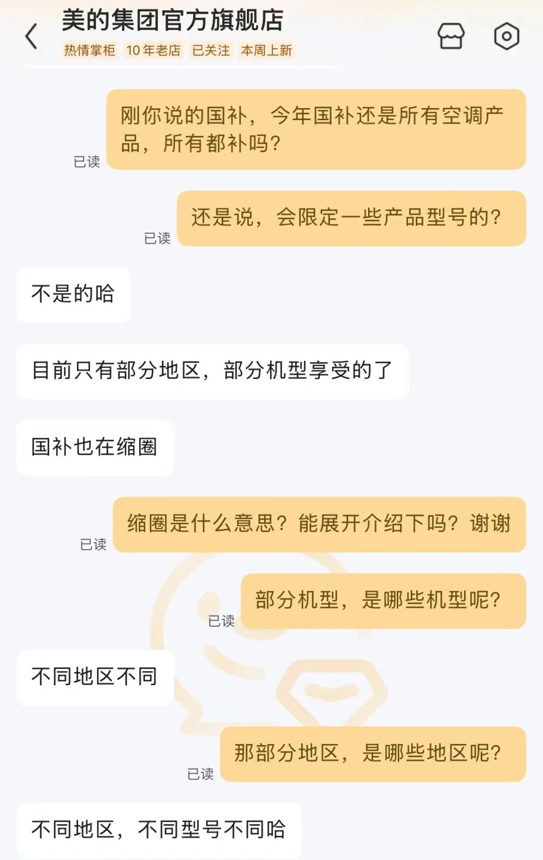 美的集团京东官方旗舰店客服证实,“国补也在缩圈”、“不同地区,不同型号不同”。