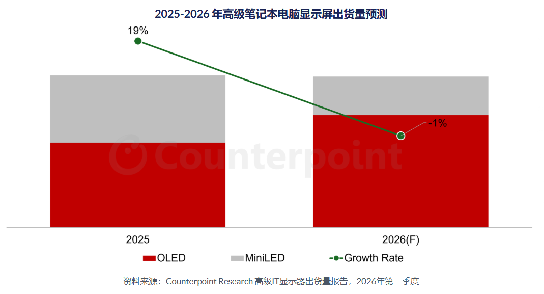 4月8日,市调机构 Counterpoint Research在报告中指出,2025年全球笔记本电脑显示器出货量同比增长 7%,而高端笔记本电脑显示器(MiniLED 和OLED)细分市场同比增长 19%,这主要得益于内存成本上涨前的提前需求、企业升级、AI PC 的普及以及新产品的推出。
