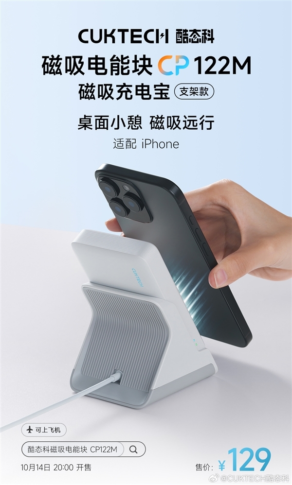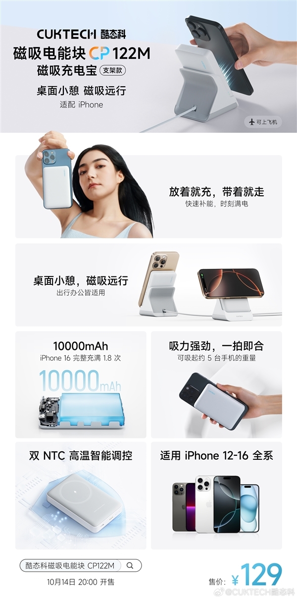 快科技10月13日消息,小米生态链企业酷态科发布了一款二合一产品——酷态科磁吸充电宝支架款CP122M。