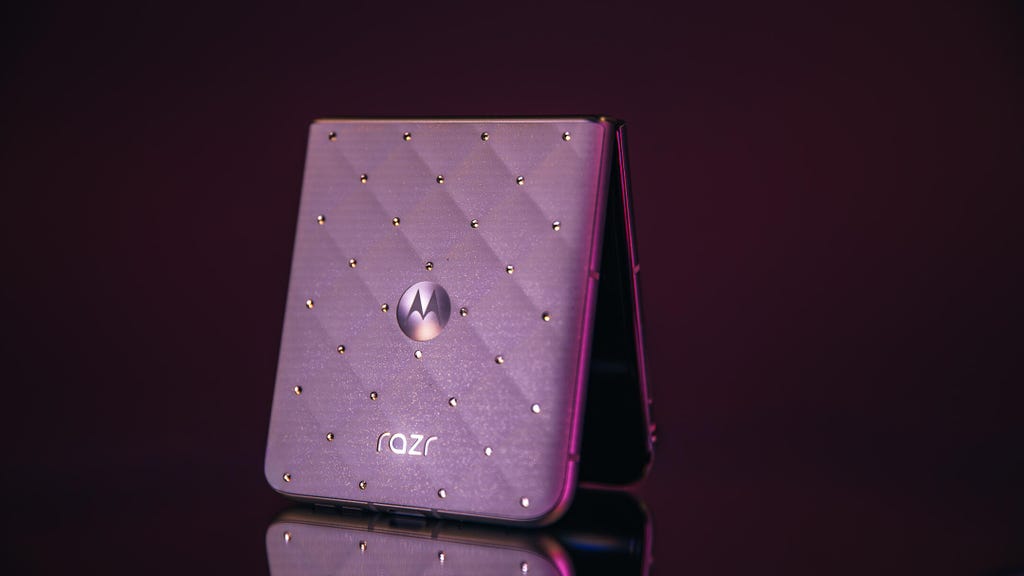 摩托罗拉在2025年Razr系列中采用了多种不同材质,例如彩通冰融版手机上的施华洛世奇水晶。Joseph Maldonado/CNET