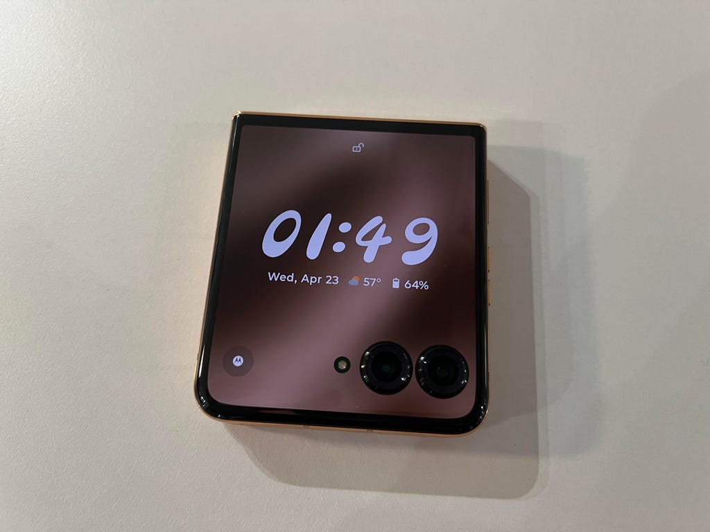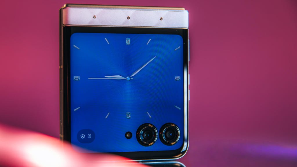 图中为2025年摩托罗拉Razr Plus,Ultra同样配备了4英寸外屏。Mike Sorrentino/CNET