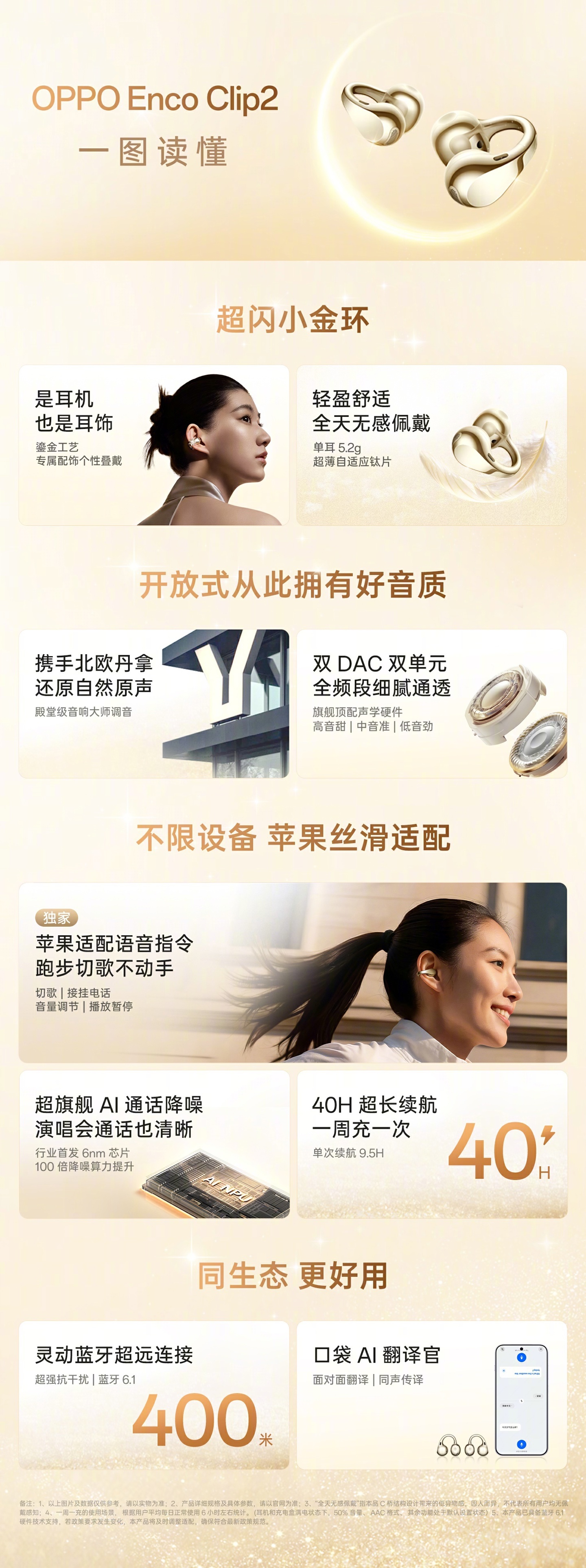 新品支持 40 小时超长续航,单次续航可达 9.5 小时;支持蓝牙 6.1,实现 400 米灵动蓝牙超远连接;支持面对面翻译、同声传译。