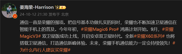 对此,荣耀终端有限公司中国区CMO姜海荣表示:通信一直是荣耀的强项,把信号基本功做扎实的同时,荣耀也不断加速卫星通信在智能手机上的普及。