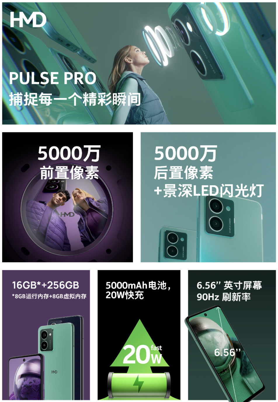 HMD Pulse Pro 手机搭载 6.6 英寸的 HD+ 90Hz 刷新率显示屏,配有 50MP 自拍摄像头。背面采用竖置双摄,规格为 50MP 主摄 + 2MP 景深。