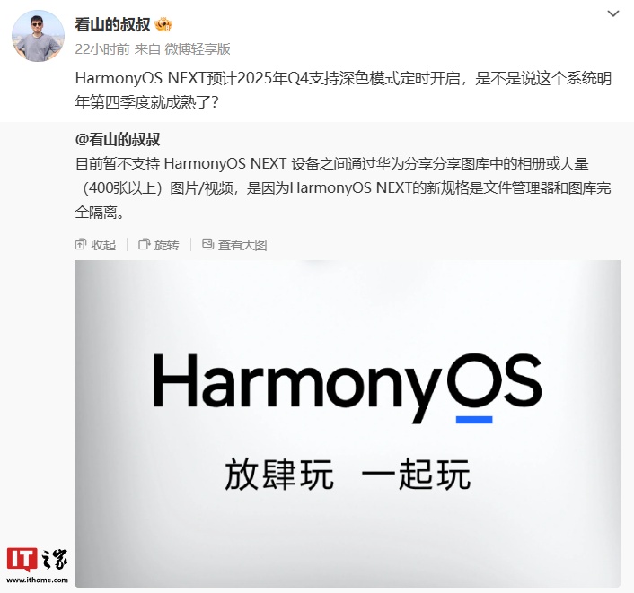 另外,博主还表示 HarmonyOS NEXT 预计 2025 年 Q4 支持深色模式定时开启。