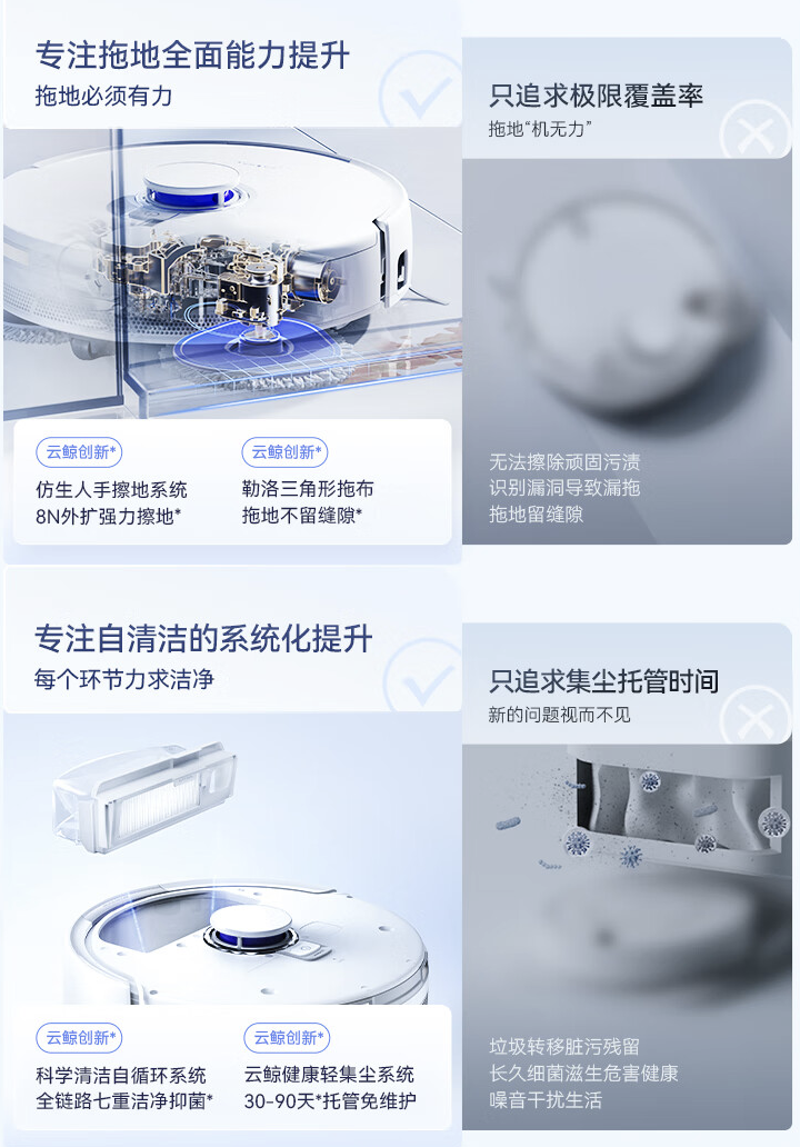 在拖地方面,云鲸 J5 采用了仿生人手擦地系统,配备勒洛三角形拖布和 8N 外伸擦地功能;同时内置云鲸健康轻集尘自清洁系统,可实现 30-90 天的托管免维护周期。