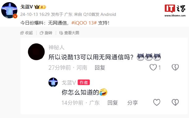IT之家 10 月 13 日消息,iQOO 产品经理 @戈蓝V 今日爆料称,iQOO 13 手机支持无网通信功能。在此之前,vivo X200 系列手机已经确认首发最远超 1.5 公里无网通信技术。