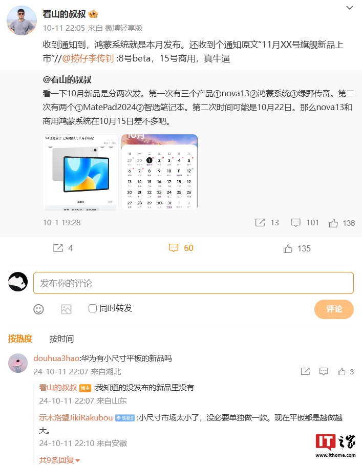 IT之家 10 月 13 日消息,博主 @看山的叔叔 于 10 月 11 日发文称收到通知,鸿蒙系统(结合此前微博消息来看,此处指商用鸿蒙系统)就是本月发布,同时 11 月 XX 号旗舰新品上市。