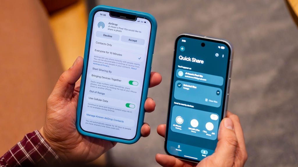 安卓手机开始支持苹果的AirDrop功能,如Pixel 10A(右)正在与iPhone 12 Pro Max共享照片。Joseph Maldonado/CNET