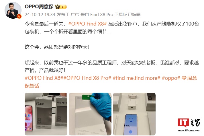 IT之家 10 月 13 日消息,OPPO Find X8 系列手机已官宣 10 月 24 日发布,Find 系列产品负责人周意保昨日发微博晒出了产线包装机照片。
