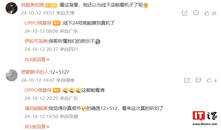 评论区中有网友询问配置是否为“12+512”,得到了周意保“这都能看清”的回复,暗指新机将有该配置;另外他还表示“线下 24 号就能摸到真机”。