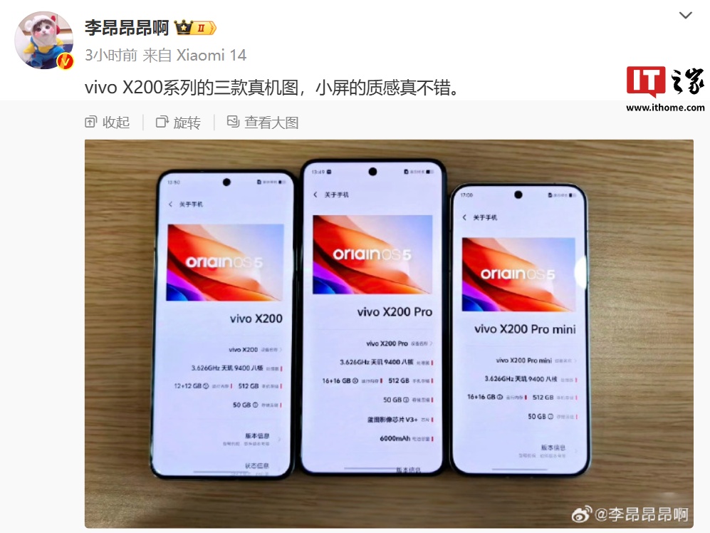 IT之家今日早些时候报道,vivo X200 系列三款真机同框图已曝光,三款机型尺寸不一,均搭载天玑 9400 处理器,其中 Pro 机型还有 6000mAh 电池。