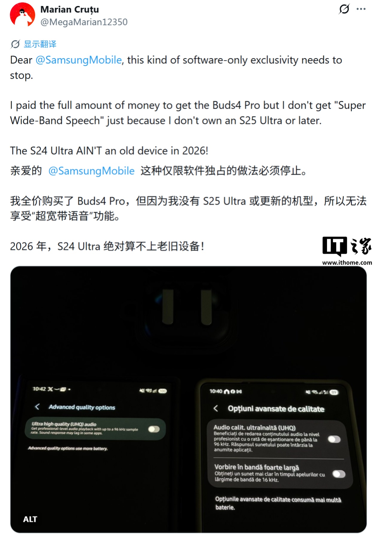 IT之家 4 月 11 日消息,科技媒体 Wccftech 昨日(4 月 10 日)发布博文,报道称 Galaxy S24 Ultra 手机用户反馈,三星通过软件限制,人为“阉割”旧款旗舰功能,导致无法使用 Galaxy Buds4 Pro 的高解析音频(Super Wideband)语音技术。