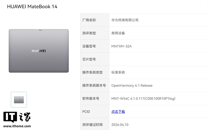 IT之家 4 月 11 日消息,华为 MateBook 14 2026(MNTXM-32A)及 MateBook Pro(HAD-W32)已于昨日通过开源鸿蒙 OpenHarmony 评测认证,均预装了最新的 6.1.0.117 版本系统。