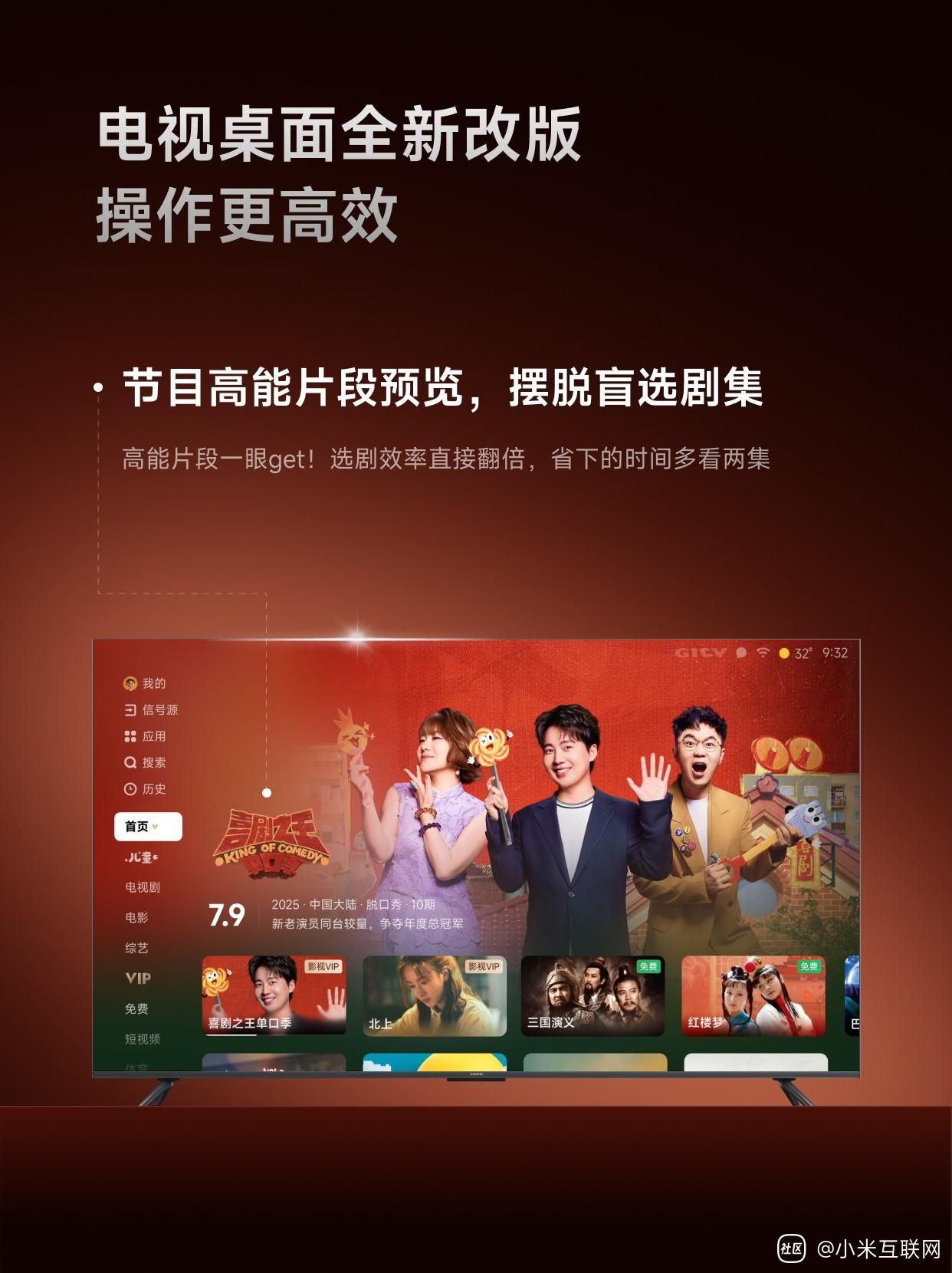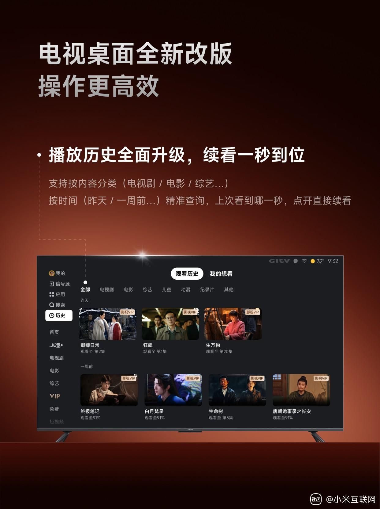IT之家 4 月 12 日消息,为了给用户带来更流畅、更丰富的电视使用体验,小米电视桌面即将迎来重磅版本升级,正式迈入 4.0 时代。本次升级将于 4 月 13 日起陆续推送,覆盖多款热门机型。