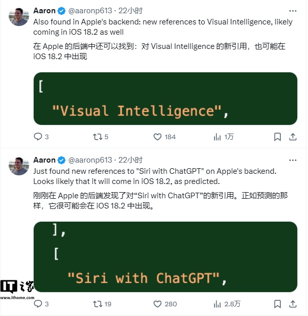这两项功能分别是支持 ChatGPT 的 Siri 和 iPhone 16 的视觉智能(Visual Intelligence)。这两项功能都原本预计“今年晚些时候”推出,也就是很可能在 iOS 18.2 中推出。后端的新增内容是一个好迹象,表明进度不会有延迟。
