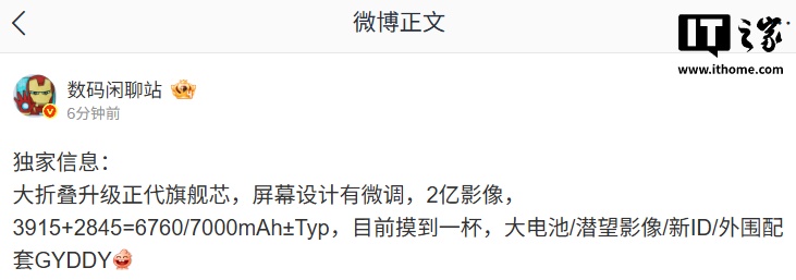 IT之家 4 月 13 日消息,博主 @数码闲聊站 今日爆料,某厂大折叠升级正代旗舰芯,屏幕设计有微调,搭载 2 亿影像、7000mAh± 电池等,评论区网友推测为 vivo X Fold6。