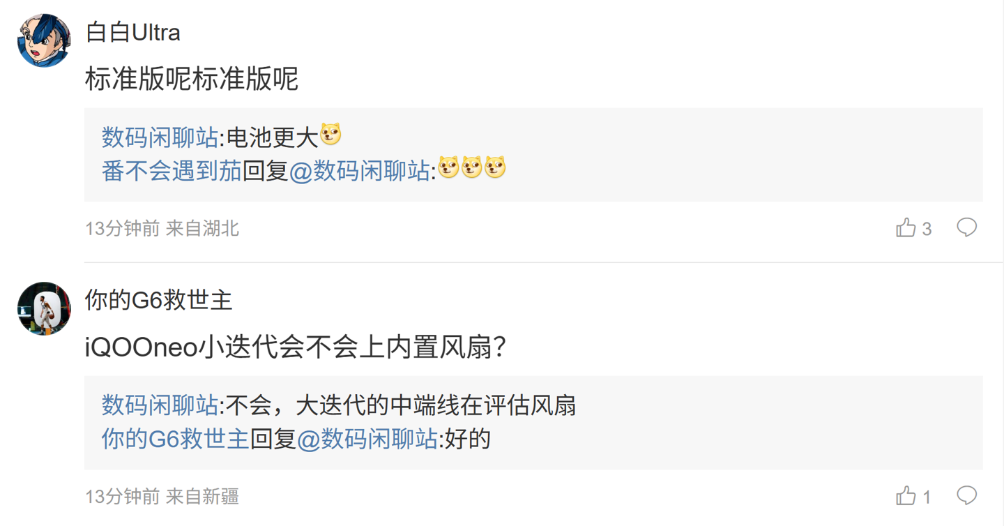 后续有用户在评论区询问:“标准版呢标准版呢”,博主回复道:“电池更大”;另一名用户则询问道:“iQOOneo 小迭代会不会上内置风扇?”,博主则回复道:“不会,大迭代的中端线在评估风扇”。