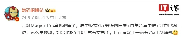根据博主 @数码闲聊站 9 月爆料,荣耀 Magic 7 Pro 采用居中胶囊孔 + 等深四曲屏 + 直角金属中框 + 红色电源键设计,预计将搭载骁龙 8 至尊版。