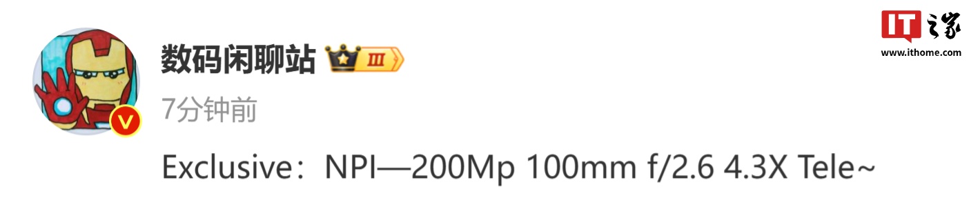 IT之家 10 月 14 日消息,博主 @数码闲聊站 今日透露,某手机搭载两亿像素 100mm f/2.6 4.3 倍长焦。