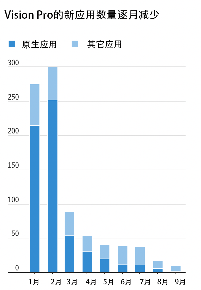 Vision Pro 平台上每个月新推出的应用数量正在明显减少。根据分析公司 Appfigures 的数据,今年 9 月份,Vision App Store 应用商店只推出了 10 款应用,而在该设备推出的前两个月里,有数百款应用上线。
