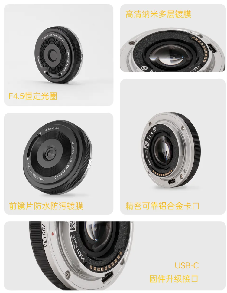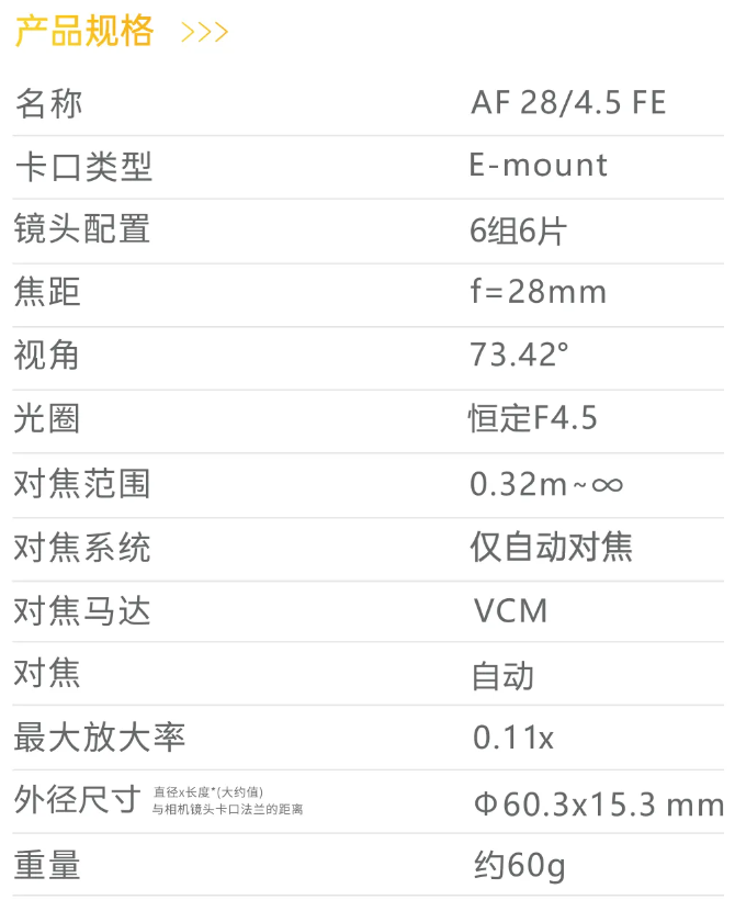 唯卓仕 28mm F4.5 饼干镜头现已上架京东预约,首发价 449 元起,可领 10 元券,到手价 439 元起,IT之家附参数表如下: